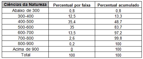 Na prova de Ciências da Natureza e suas Tecnologias, a análise TRI apontou que a menor média de proficiência observada foi 263,3. Esse número representa o início da escala para essa área, ou seja, o nível mais baixo de proficiência possível de mensuração pelas questões da prova. A maior proficiência foi 903,2.